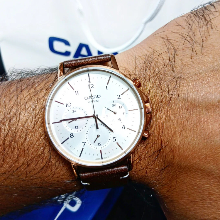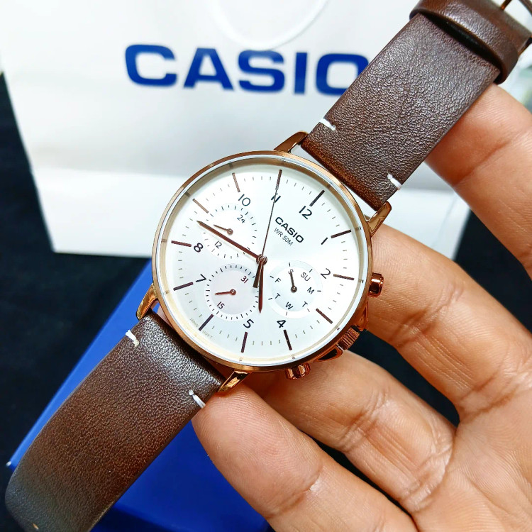 این ساعت کاسیو با اندازه 50 × 44.7 × 10 میلی متر و وزن 55 گرم، دارای قاب استیل ضد زنگ و روکش یونی رزگلد است. بند آن از جنس چرم بوده و در برابر آب تا 50 متر مقاوم است. عمر باتری تقریبا 3 سال و دقت آن ± 20 ثانیه در ماه میباشد.